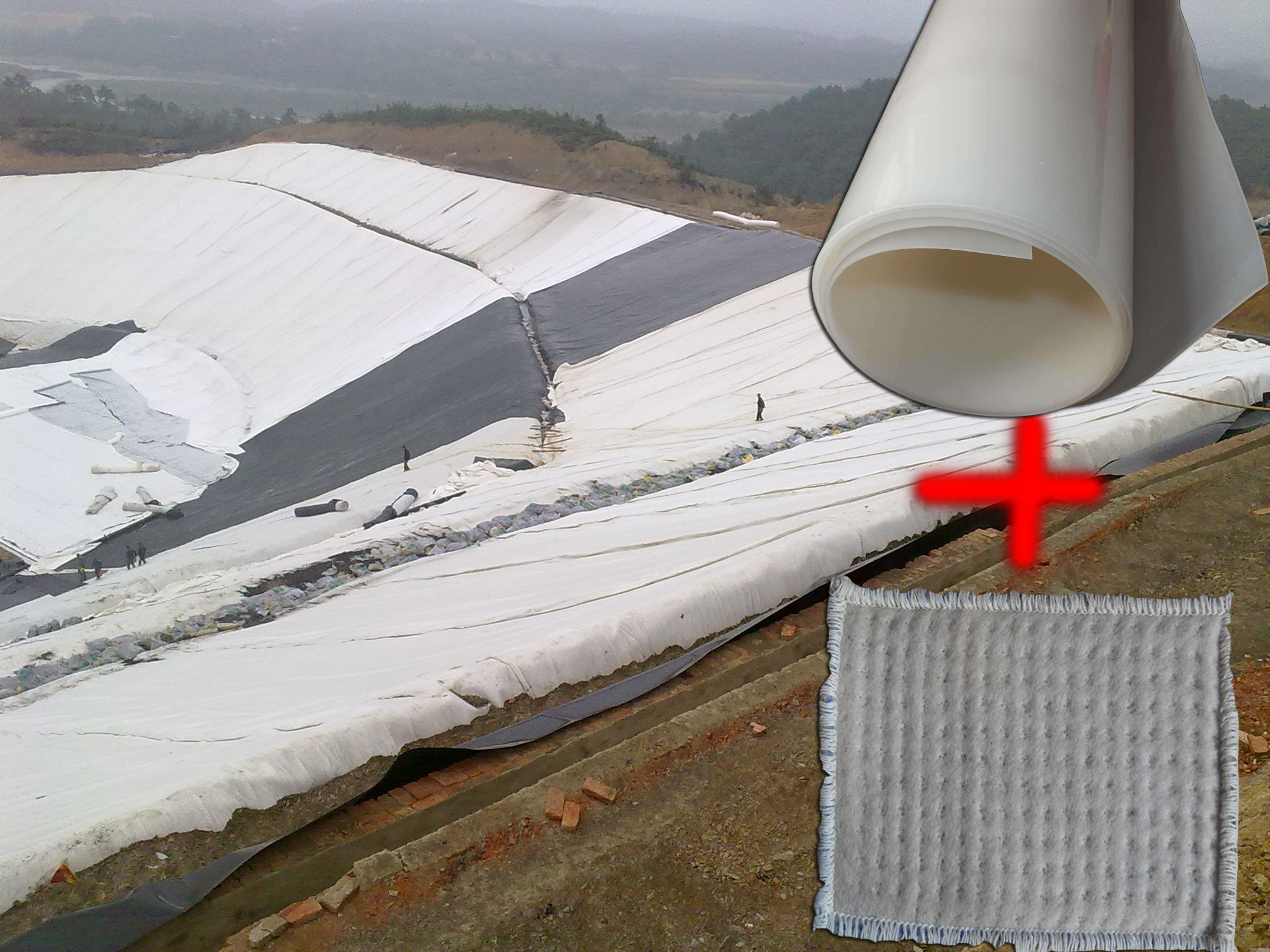 一膜一墊的鋪裝構(gòu)造組成場底防滲結(jié)構(gòu),可實(shí)現(xiàn)多種情況的防滲要求,經(jīng)濟(jì)而有效。這種是選用德旭達(dá)土工材料有限公司生產(chǎn)的1.5mm厚HDPE土工膜,土工膜上再鋪上一層4800g/㎡的膨潤土防水墊。