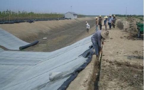 復(fù)合土工膜鋪設(shè)要求自上而下,采用人工拖拉平順,松緊適度,清除一切尖角雜物,斜坡振動碾碾壓密實平整,本項目采用兩布一膜黏結(jié),用熱熔法焊接,焊接寬度重疊10厘米。鋪設(shè)時余留約4%,以便拼接和適應(yīng)氣溫變化。接縫應(yīng)與拉力方向平行,若出現(xiàn)局部破損,采用膠黏法補(bǔ)漏。