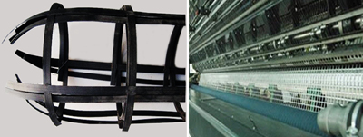 鋼塑復合土工格柵以高強鋼絲(或其他纖維),經(jīng)特殊處理,與聚乙烯(PE),并添加其他助劑,通過擠出使之成為復合型高強抗拉條帶,且表面有粗糙壓紋,則為高強度加筋土工帶。由此單帶,經(jīng)縱、橫按一定間距編制或夾合排列,采用特殊強化粘接的熔焊技術焊接其交接點而成型,則為加筋土工格柵。