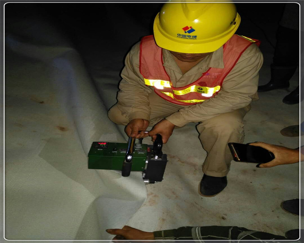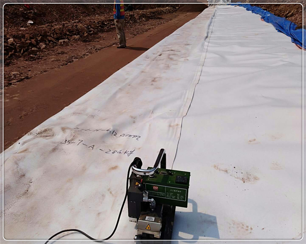 樞紐主要由復(fù)合土工膜堆石壩、溢洪道、引水發(fā)電系統(tǒng)、放空洞組成。復(fù)合土工膜堆石壩壩高85m,為高比例(達(dá)81%)軟巖填筑,軟巖填筑比例在同類型壩中世界之高。大壩防滲體采用復(fù)合土工膜防滲面板。土工膜之間的焊接和土工膜在錨帶部位的焊接,兩部位均采用熱風(fēng)粘合的方式。土工膜與土工膜之間的焊接采用全自動風(fēng)焊機進(jìn)行,焊接帶的寬度為65mm,中間留有15mm的檢查氣孔,兩側(cè)各有25mm寬的粘合段。