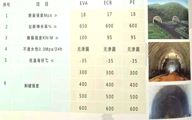 防水板又叫土工膜,習(xí)慣上把>=0.8mm厚的土工膜叫防水板,<0.8mm的叫土工膜,它是以高分子聚合物為基本原料制成的一種防滲材料,分為均質(zhì)防水板和復(fù)合防水板。吊掛式隧道專用防水板是我公司開發(fā)創(chuàng)新的新型隧道專用防水材料,實(shí)現(xiàn)無穿通釘施工懸吊排一次完成,可大大簡化傳統(tǒng)防水材料在隧道中的施工難度,提高鋪設(shè)質(zhì)量和鋪設(shè)效率,縮短工期,大幅降低工程綜合造價(jià),具有極強(qiáng)的市場競爭優(yōu)勢。